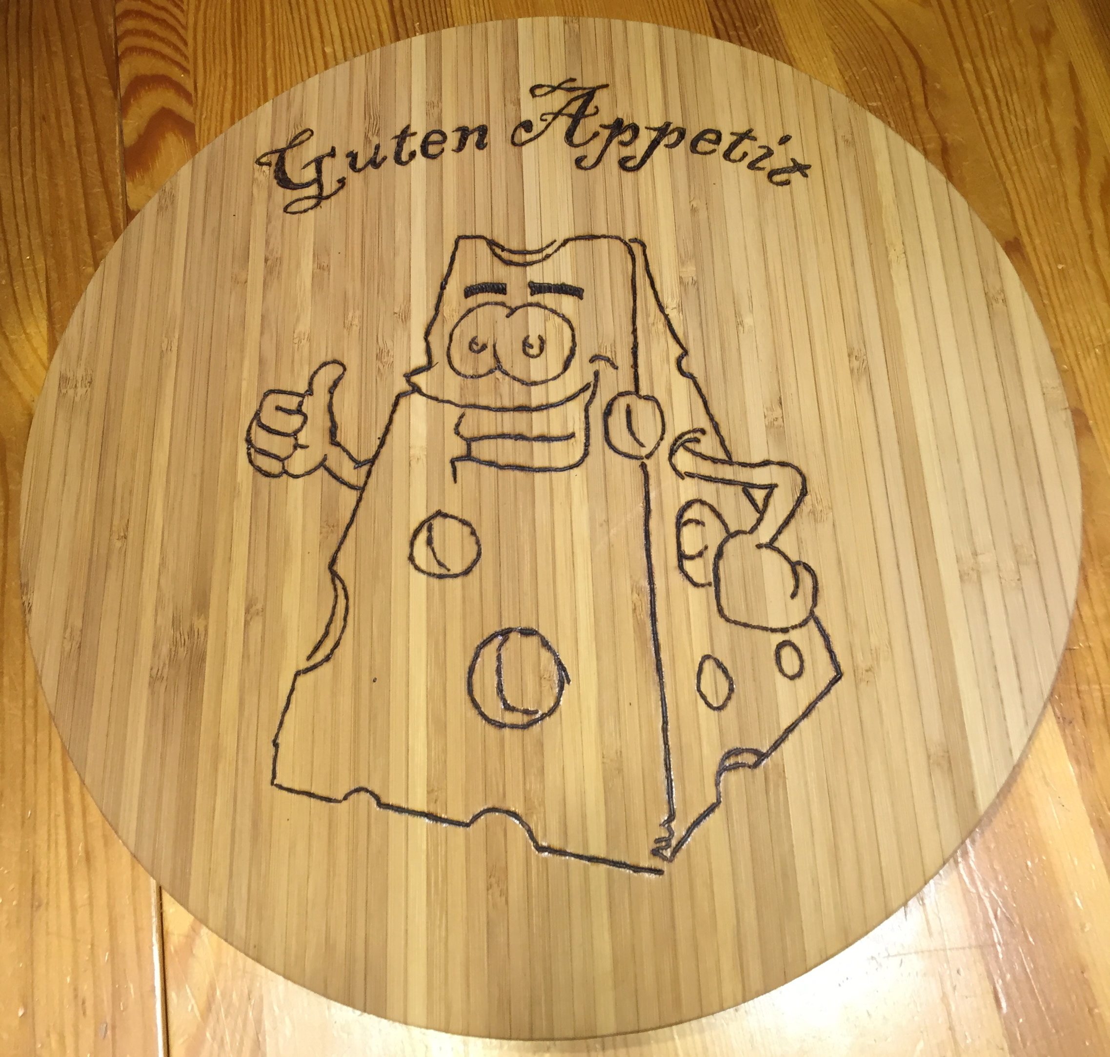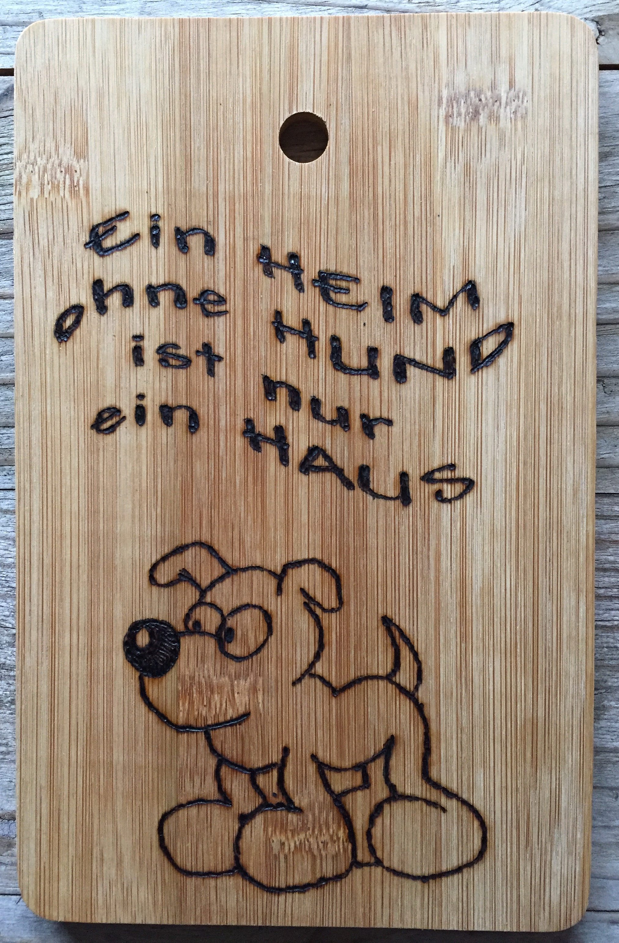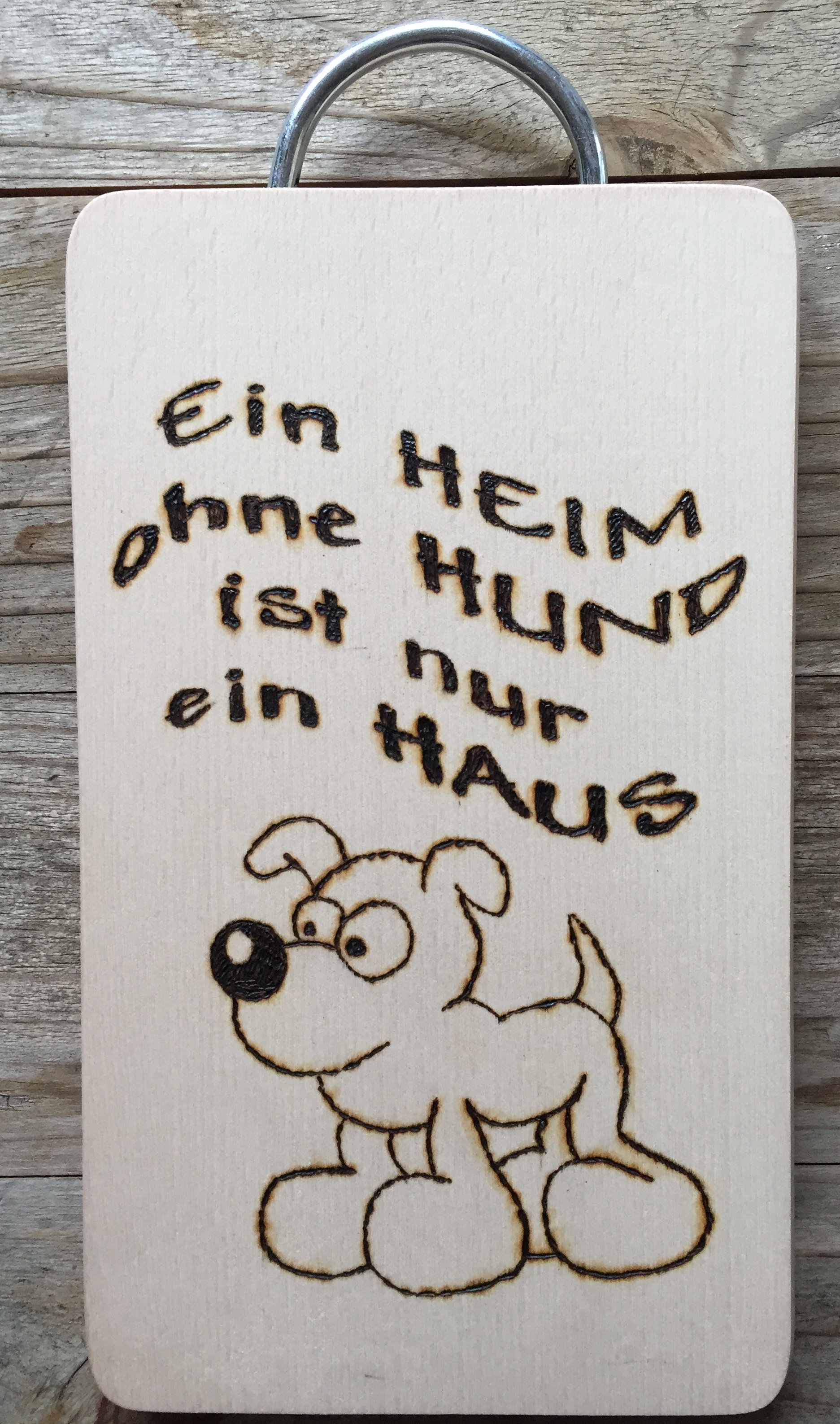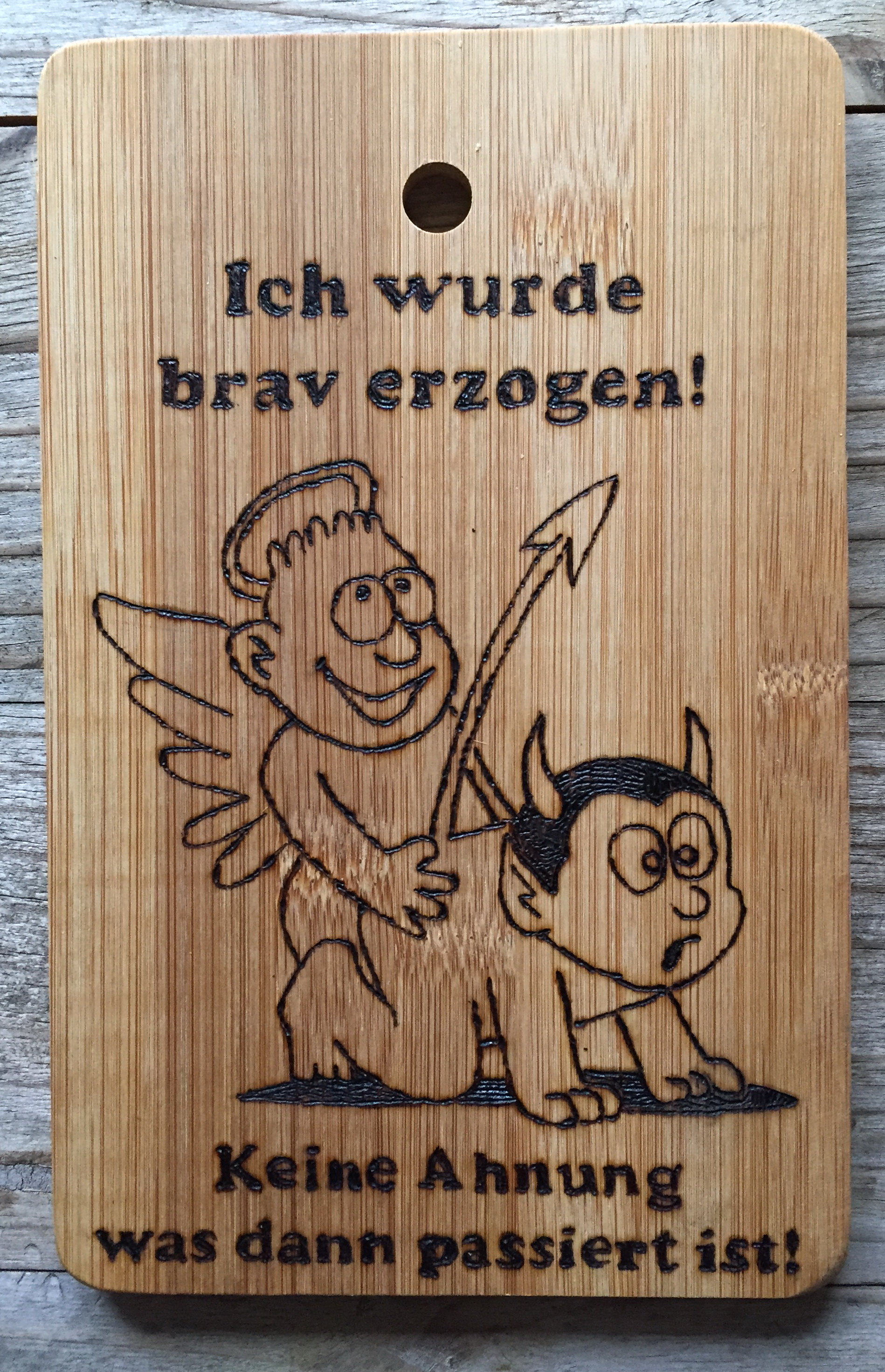 Naturholz und Spanplatte eignen sich im Regelfall gut zum Brennen. Wunschmotive und Widmungen von ‚ick lieb dir‘ bis zu ‚von Reginald und Tante Erika‘ sind machbar.