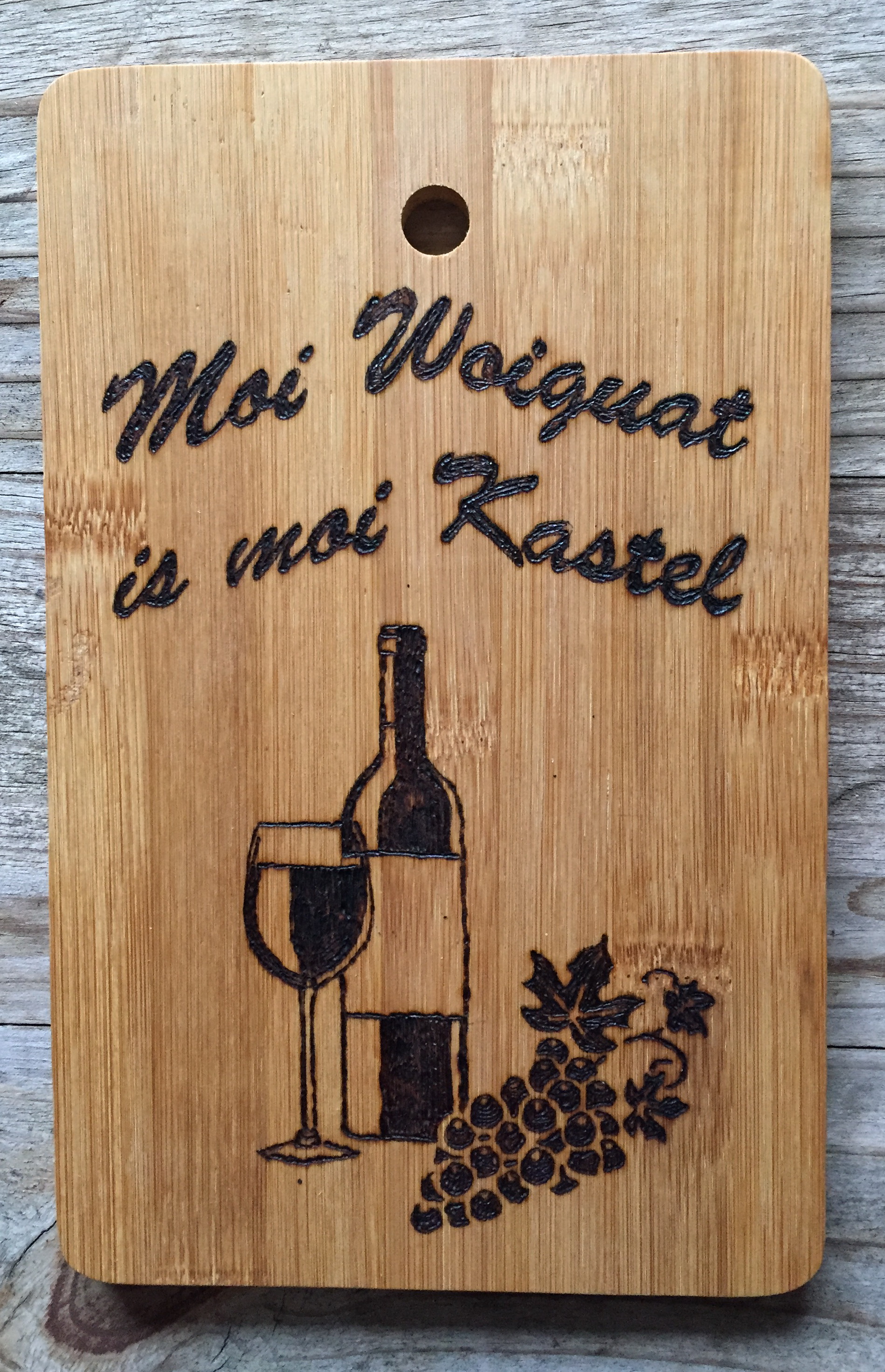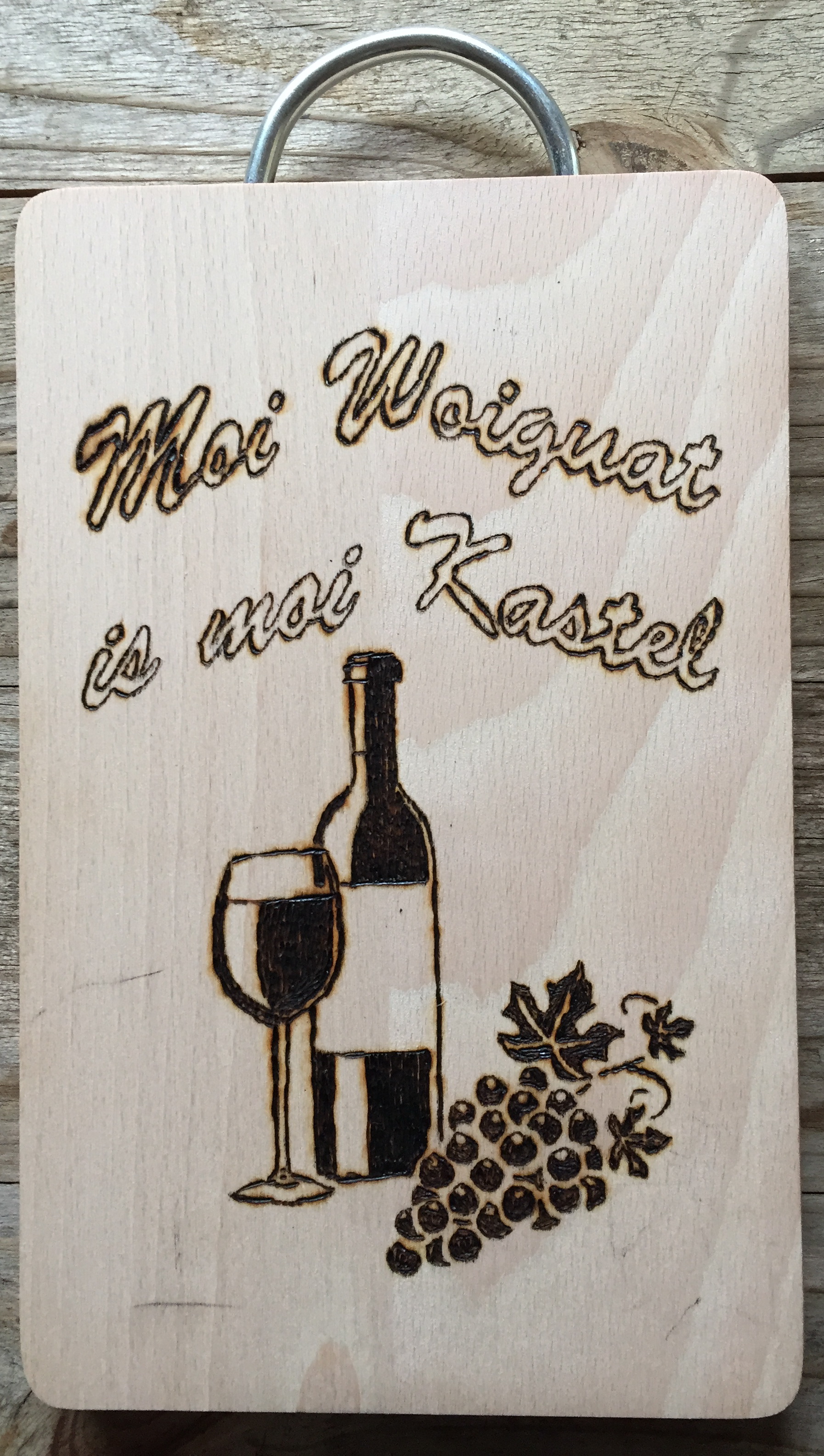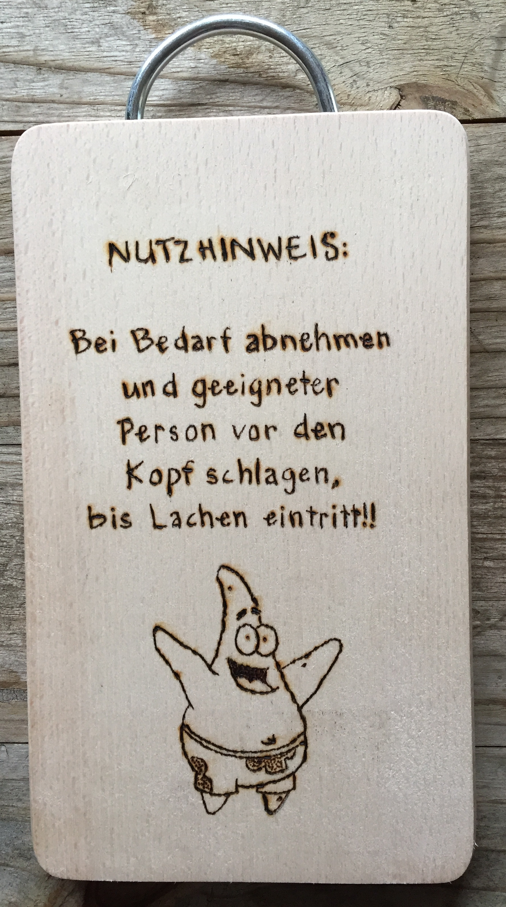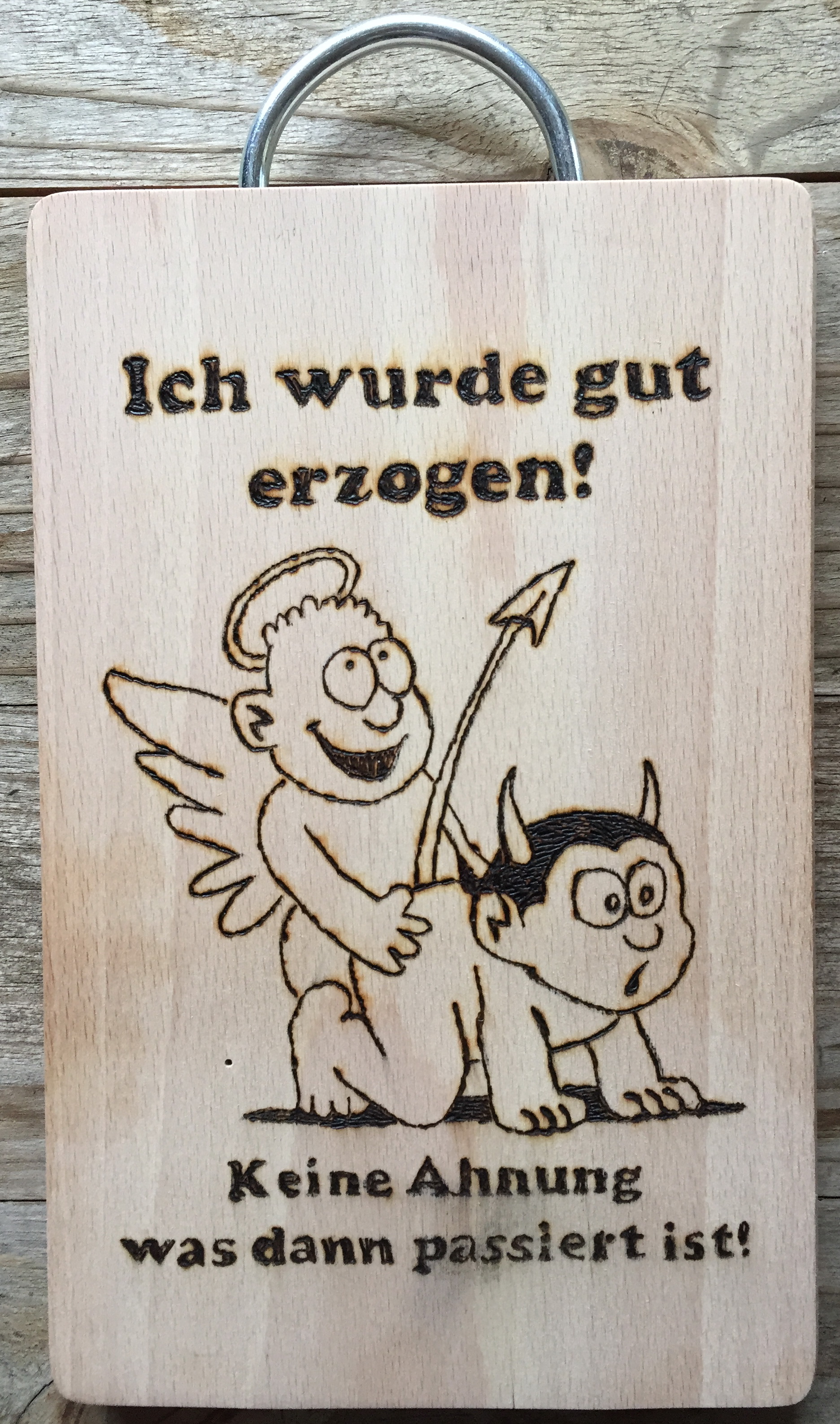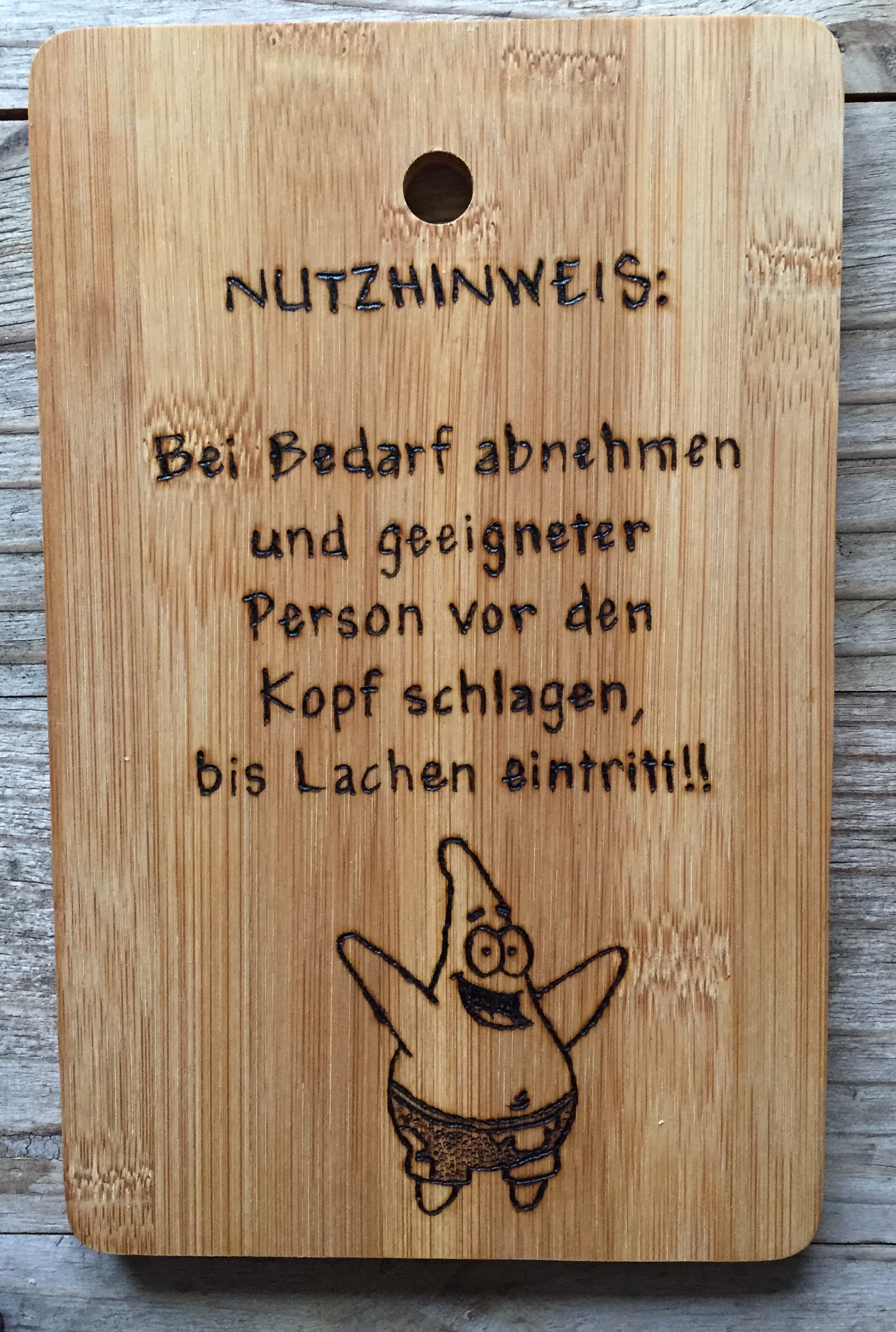 Naturholz und Spanplatte eignen sich im Regelfall gut zum Brennen. Wunschmotive und Widmungen von ‚ick lieb dir‘ bis zu ‚von Reginald und Tante Erika‘ sind machbar.